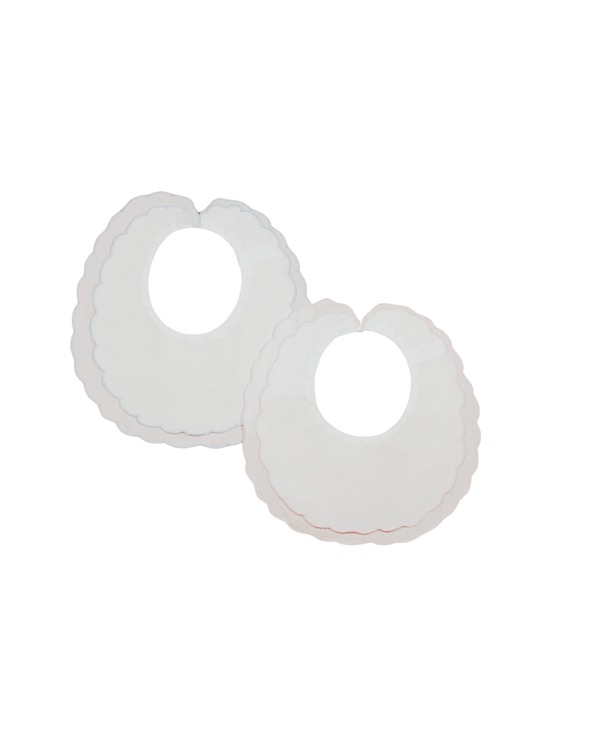 All scalloped bibs are stitched by Tice & Co. Embroidery and Design, and are hand-made to order.